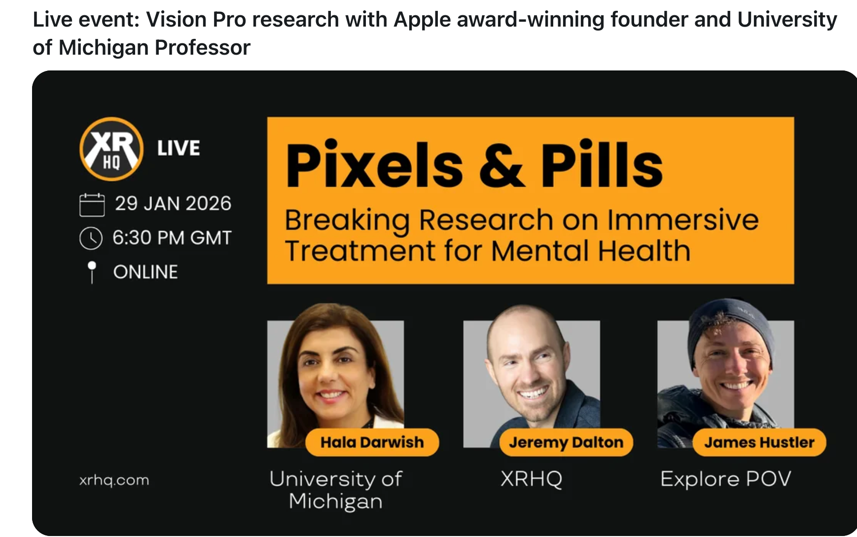 Event Description: Research is currently underway using Apple Vision Pro to immerse patients in breathtaking natural environments to see whether these experiences can help people suffering from anxiety and depression. Dr. James Hustler, creator of the award-winning Explore POV app, and Associate Professor at the University of Michigan. Join Hala Darwish for a live discussion hosted by XRHQ’s Jeremy Dalton. Together we will explore the technology, the clinical thinking that inspired it, and what it could mean for the future of digital care.